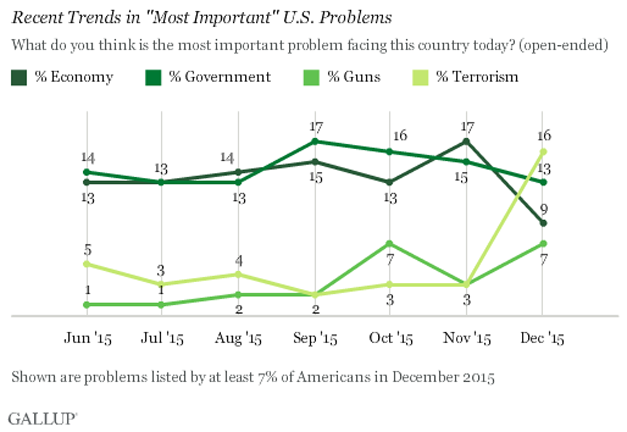 Following the deadly terror attacks in Paris and San Bernardino, Calif., 16 percent of Americans consider terrorism to be the most important problem facing the United States, according to a new Gallup survey released Monday. This is a drastic increase since November, when just 3 percent agreed.