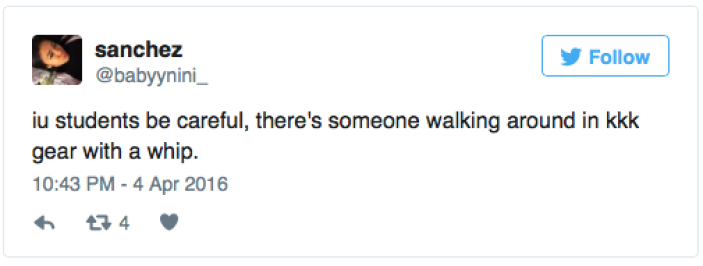 The Tab reported that college students in Bloomington reported seeing a “KKK member holding a whip” around campus on Monday night.