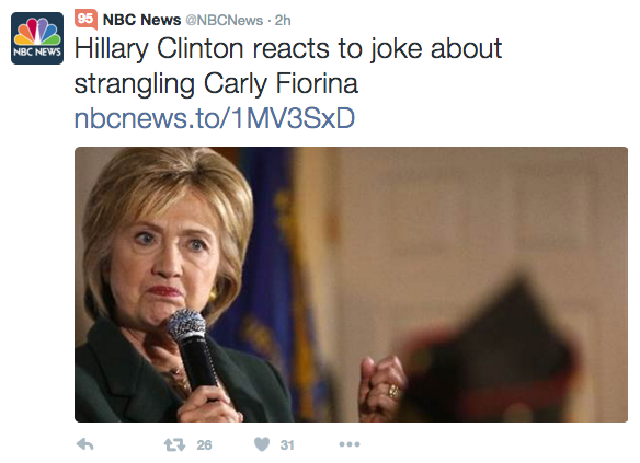 The picture included in the tweet showed the Democratic front-runner, lips pursed and brow furrowed, under the headline, “Clinton responds reacts to joke about strangling Carly Fiorina.”