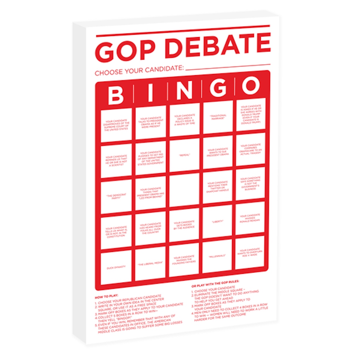 “Your candidate invokes Ronald Reagan,” one square says. “Your candidate compares Obamacare to an actual tragedy,” says another. A third says, “Your candidate wants to overturn Roe v. Wade.”