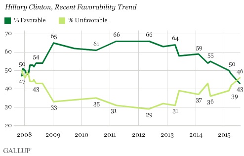 Amidst a spate of congressional investigations into her use of private email during her stint as secretary of state, Clinton’s unfavorable rating rose to 46 percent, her worst score since December 2007. The number of people who view her favorably also dropped from 48 percent to 43 percent in April, Gallup reports.