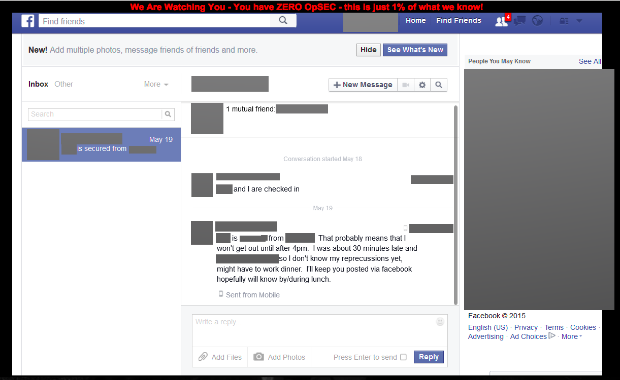 “We Are Watching You — You have ZERO OpSEC [operational security] — this is just 1% of what we know!”