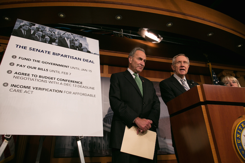 Sen. Harry Reid addresses the press, in October 2013, after the Senate approved a bipartisan budget deal, as Sen. Chuck Schumer looks on. (Graeme Jennings/Examiner)