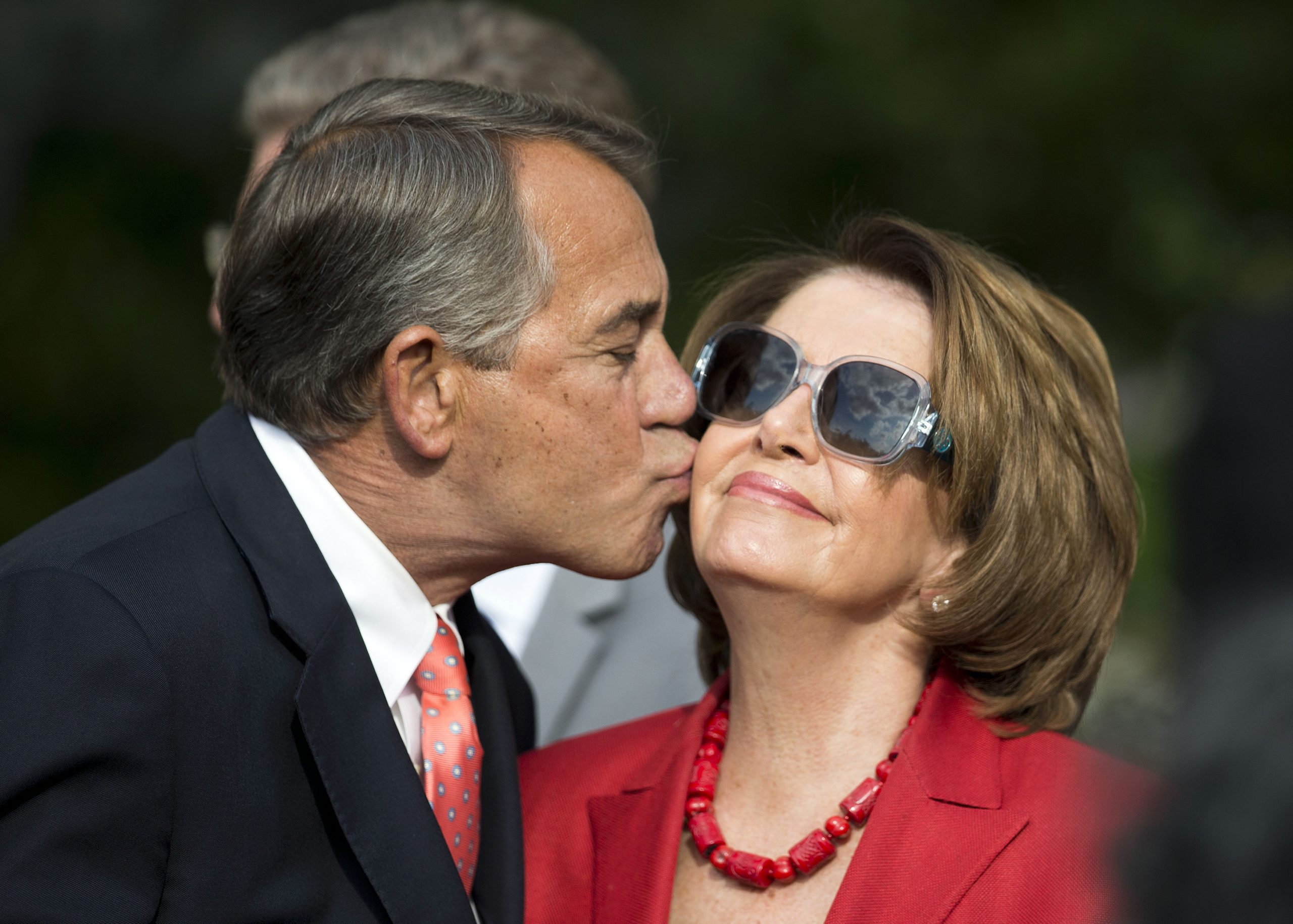 House Speaker John Boehner of Ohio kisses House Minority Leader Nancy Pelosi in the Rose Garden of the White House.