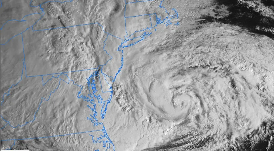 Hurricane Sandy (image via GOES-East Visibile Satellite) as it makes landfall on the U.S. East Coast in October of 2012. (Photo courtesy of the National Weather Service)