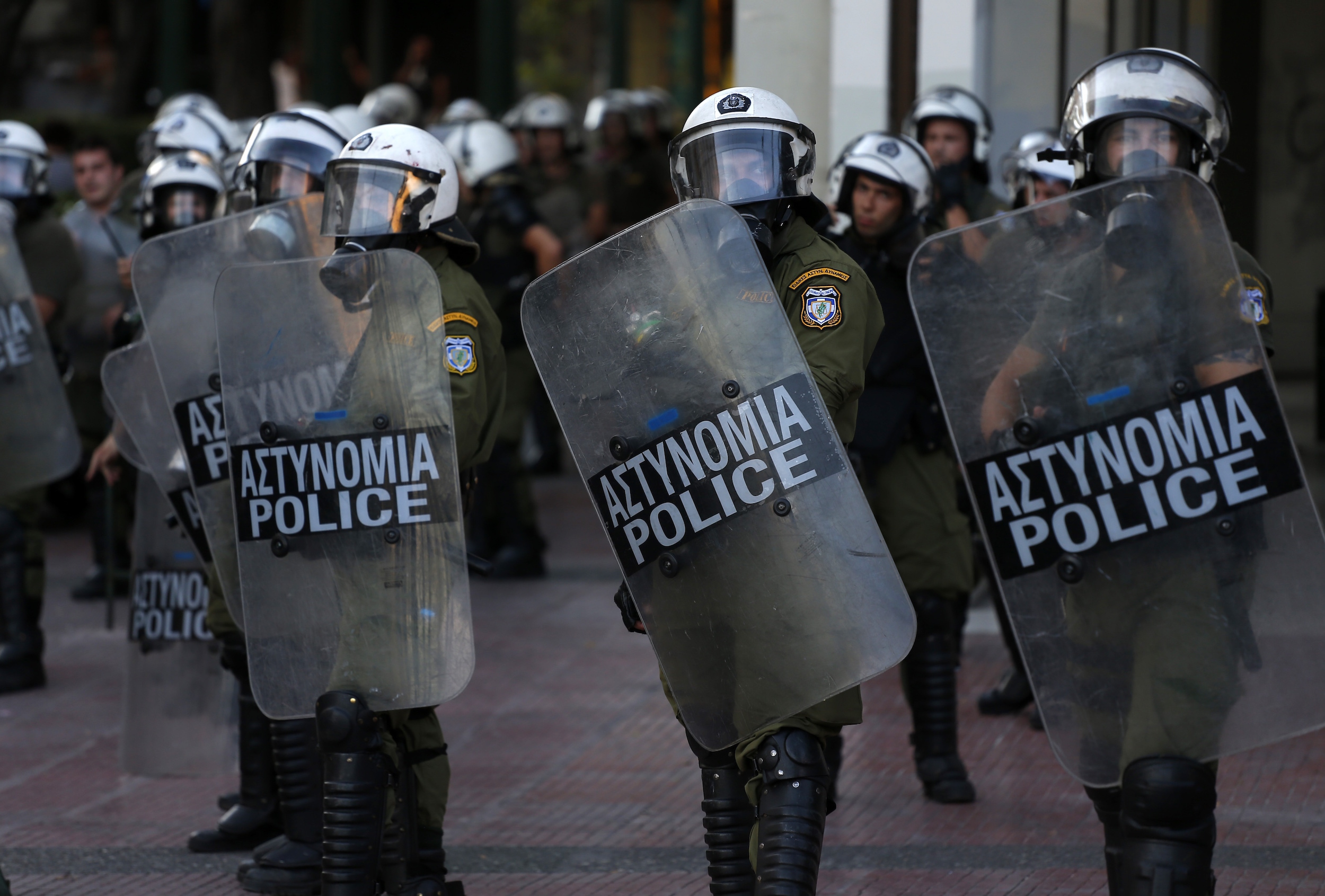 Riot police guard near an anti-austerity protest in Athens, Wednesday, July 15, 2015. (AP Photo/Emilio Morenatti)