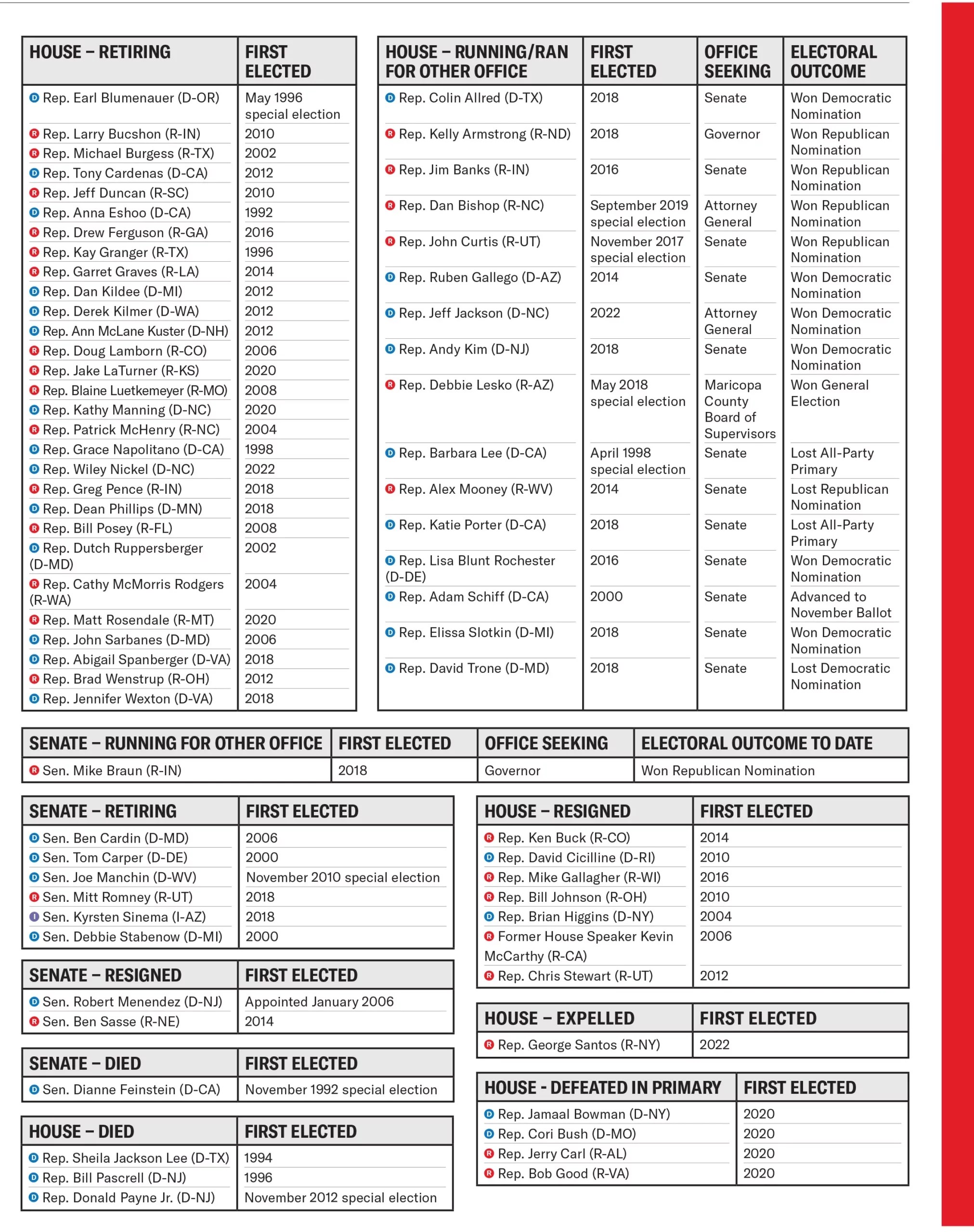 The list of departing lawmakers is already long but can be expected to grow after the Nov. 5 general election. It’s virtually certain that it will expand shortly after Election Day when Rep. Adam Schiff (D-CA) is heavily favored to win California’s open Senate seat. Because Schiff is also set to win a separate election to fill the final two months of the late Democratic Sen. Dianne Feinstein’s term, plus a new, six-year Senate term, he is expected to resign the House seat he’s held since January 2001 to become a senator about seven weeks ahead of the new Congress convening.