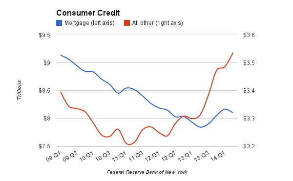 Non-housing debt increased by 2 percent, led by a $30 billion increase in auto loans, with student borrowing and credit card debt also rising steadily, according to the New York Fed’s Quarterly Report on Household Debt and Credit. Those gains mirror the results from the Federal Reserve Board of Governors’ latest report, which shows consumer credit growing at the fastest pace since the economic recovery began.