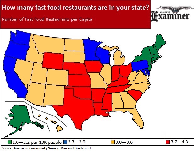 Information compiled by the Washington Examiner tended to show that the states with the least amount of fast food restaurants and lower obesity rates are western or northeastern states. On the other hand, those areas with the highest number of fast food restaurants and greater prevalence of diabetes were congregated in the Midwest and South.