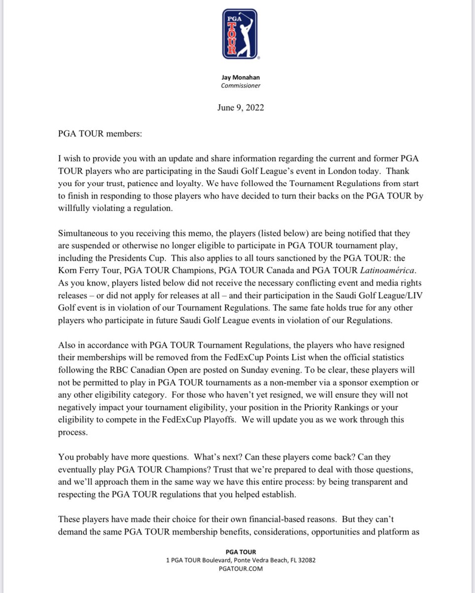 He added that he is disappointed in the former PGA Tour members who left the organization.