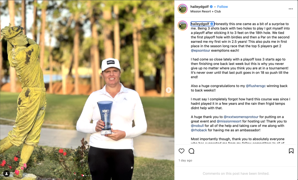 “I had come so close lately with a playoff loss 3 starts ago to then finishing one back last week but this is why you never give up no matter where you think you are at in a tournament!” Davidson wrote on Instagram. “It’s never over until that last putt goes in on 18 so push till the end!”